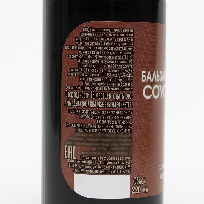 Состав: концентрированный виноградный сок, бальзамический уксус 38 % (винный уксус, виноградное сусло, краситель Е-150d), натуральный ароматизатор «Лесной орех», загуститель конжаковая камедь Е425. Массовая доля уксусной кислоты 3 %. Не содержит консервантов.