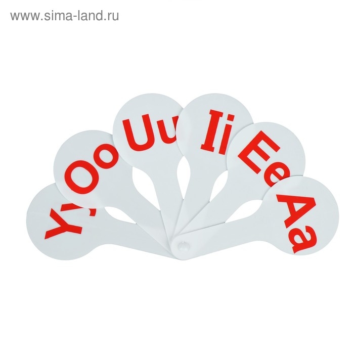 Веер содержит гласные буквы английского алфавита. Символы нанесены с двух сторон. Крупный размер и шрифт, качественная печать, устойчив к истиранию. Изготовлен из сертифицированного полипропилена. Размер в индивидуальной упаковке - 6 х 14,5 х 1 см. Поставляется в пакете с европодвесом.