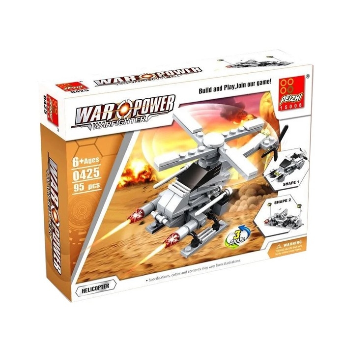 Игровой набор содержит 95 деталей и позволяет сконструировать три варианта техники: стационарный пулемёт, истребитель, вертолёт.
