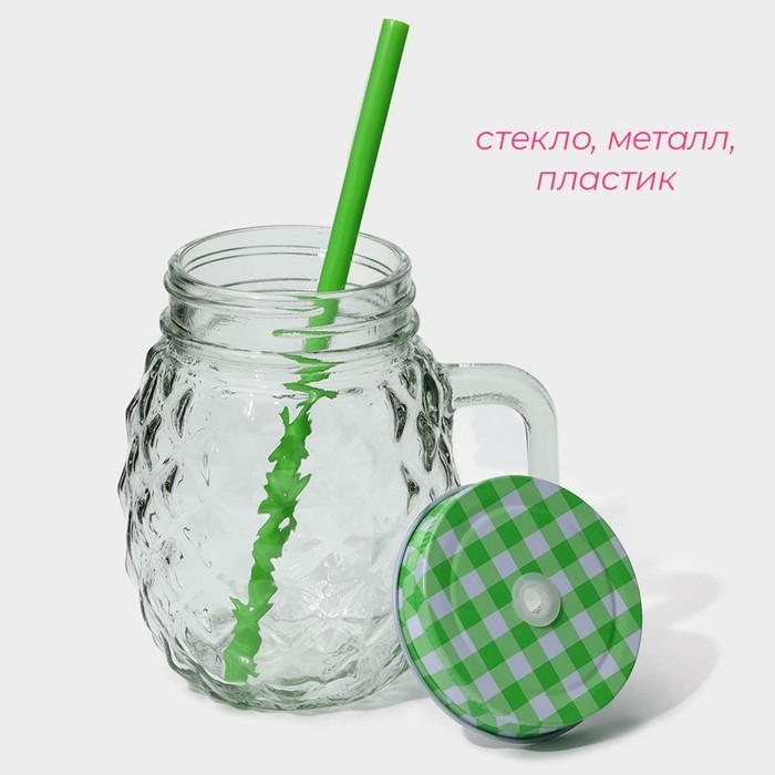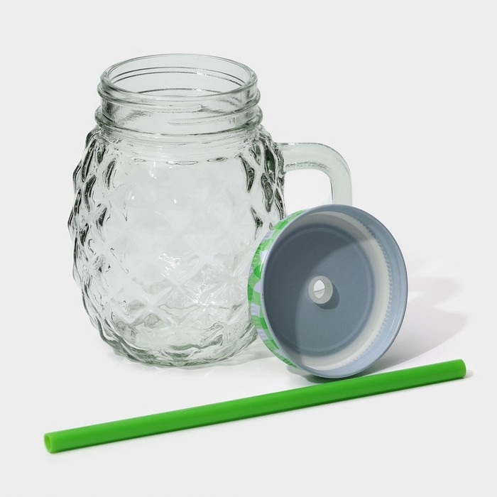 Кружка стеклянная с крышкой и трубочкой Доляна «Ананас», 500 мл, 11×8,5×13 см, цвет МИКС