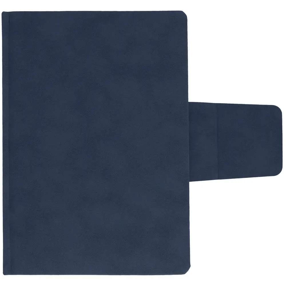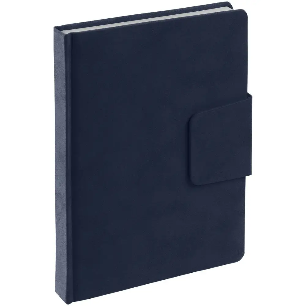 Ежедневник с твердой обложкой c поролоном, выполнен из материала Nubuck, темно-синий ХХ, дополнен капталом и ляссе темно-синего цвета. Застежка — хлястик на магните.