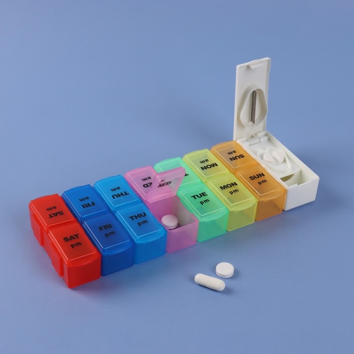 Таблетница - органайзер «Неделька», с таблеторезкой, съёмные ячейки, утро/вечер, 20 × 7,5 × 2,5 см, 7 контейнеров по 2 секции, разноцветная
