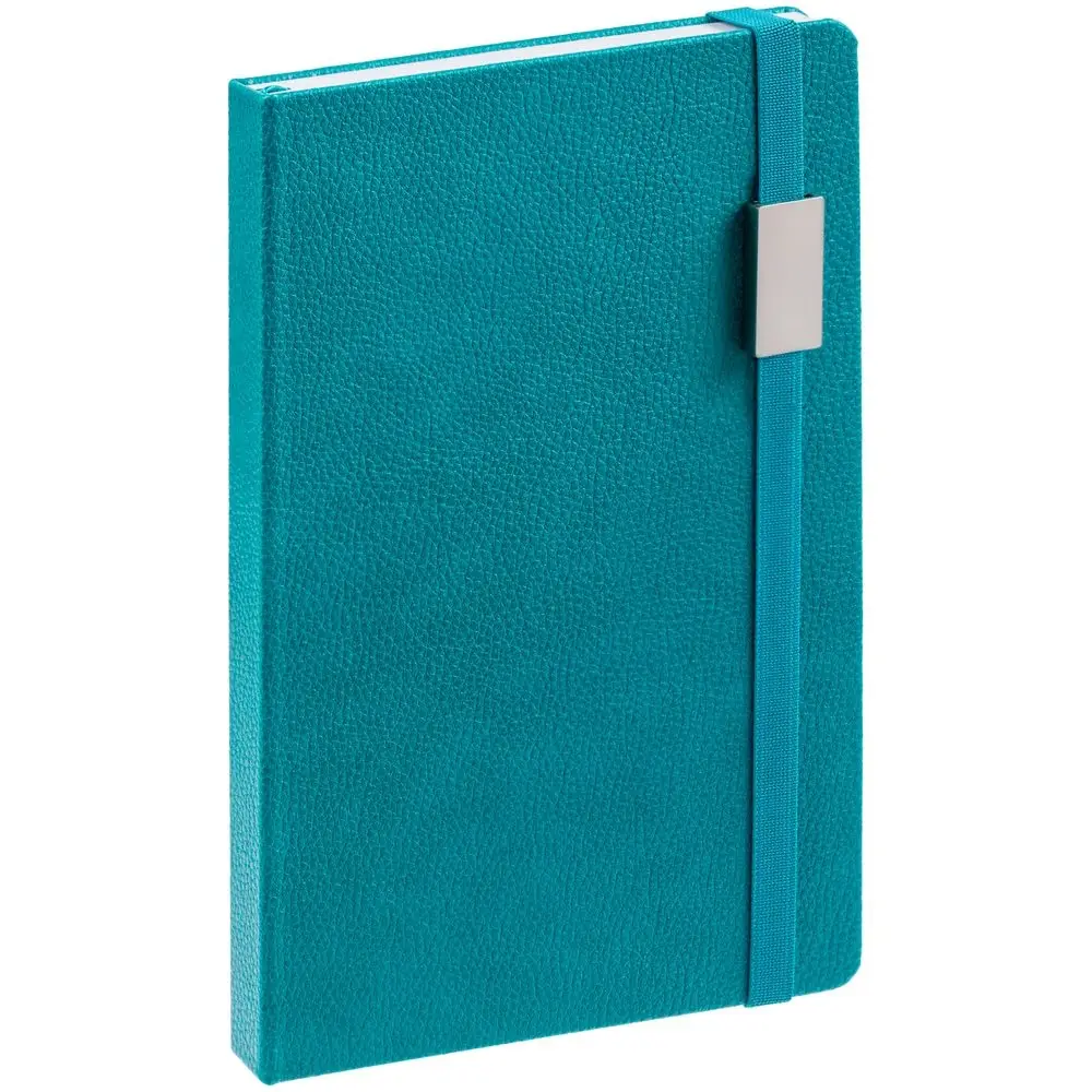 Зауженный ежедневник с прямоугольным металлическим шильдом на резинке.