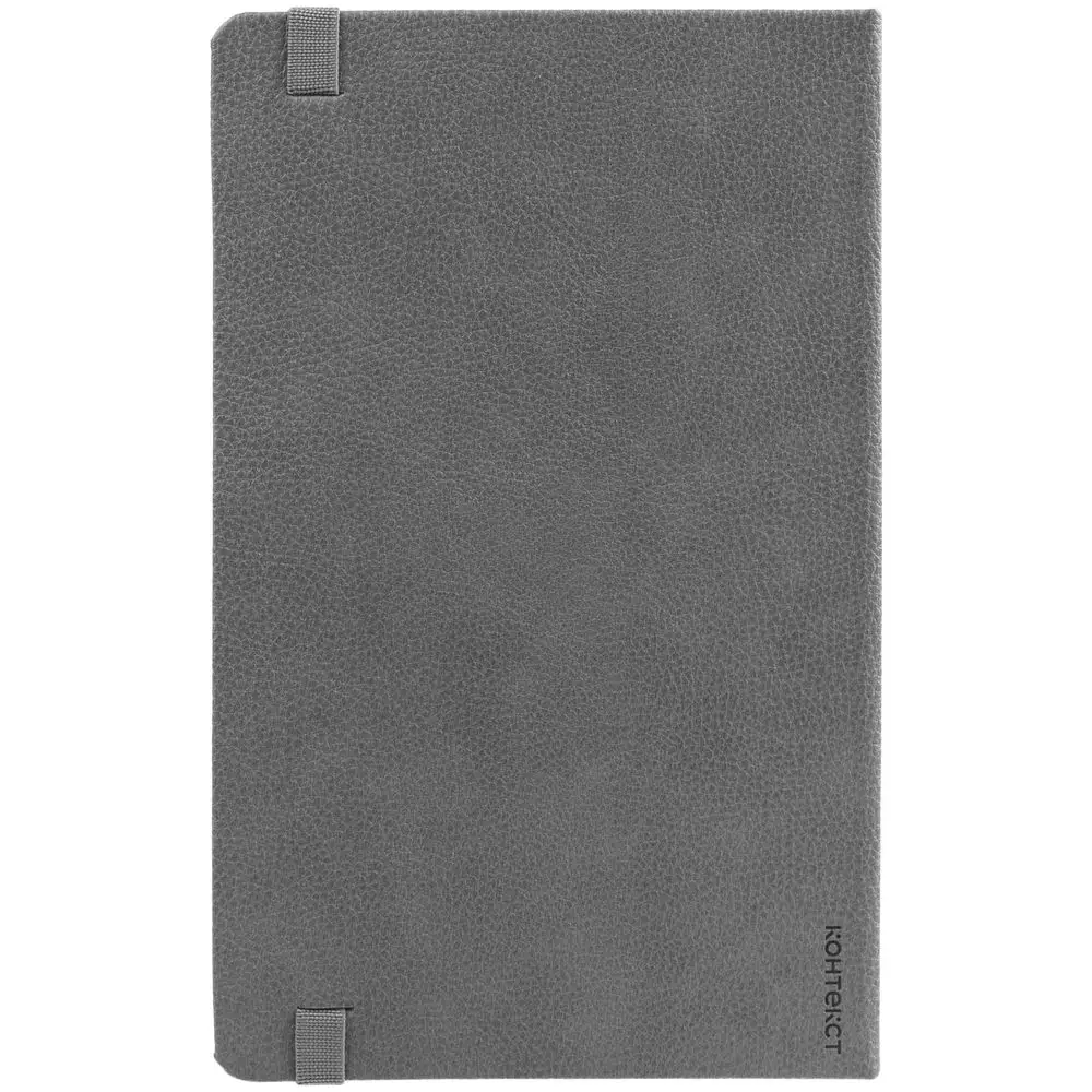 Ежедневник с твердой обложкой, выполнен из материала LaFite, серый СС, дополнен резинкой с металлическим прямоугольным шильдом и ляссе в цвет обложки.