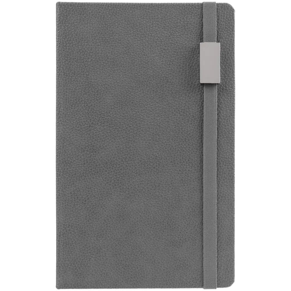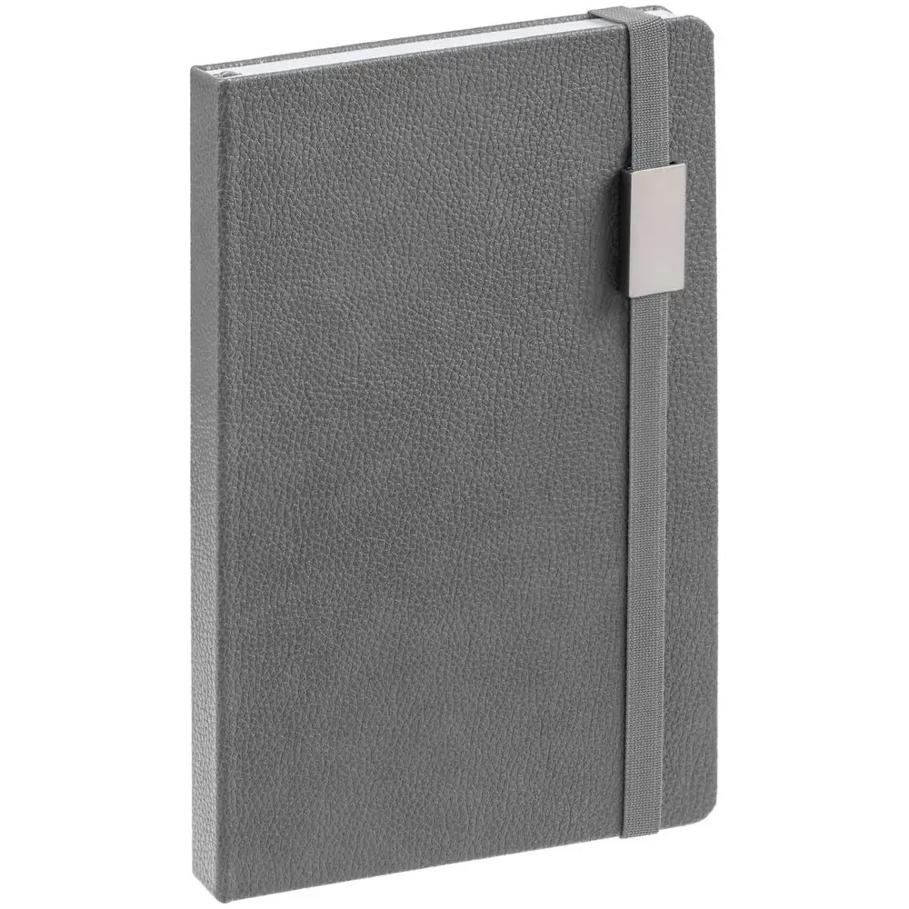 Зауженный ежедневник с прямоугольным металлическим шильдом на резинке.