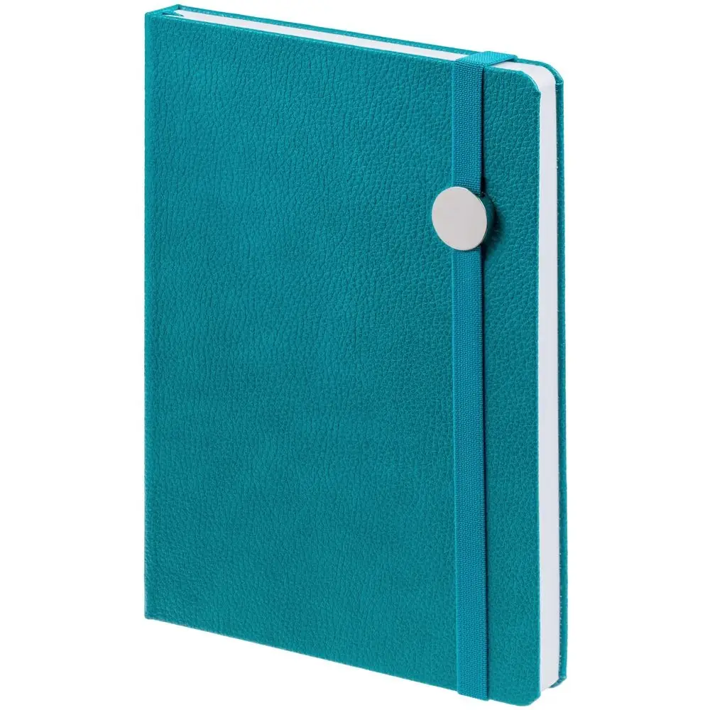 Зауженный ежедневник с круглым металлическим шильдом на резинке.