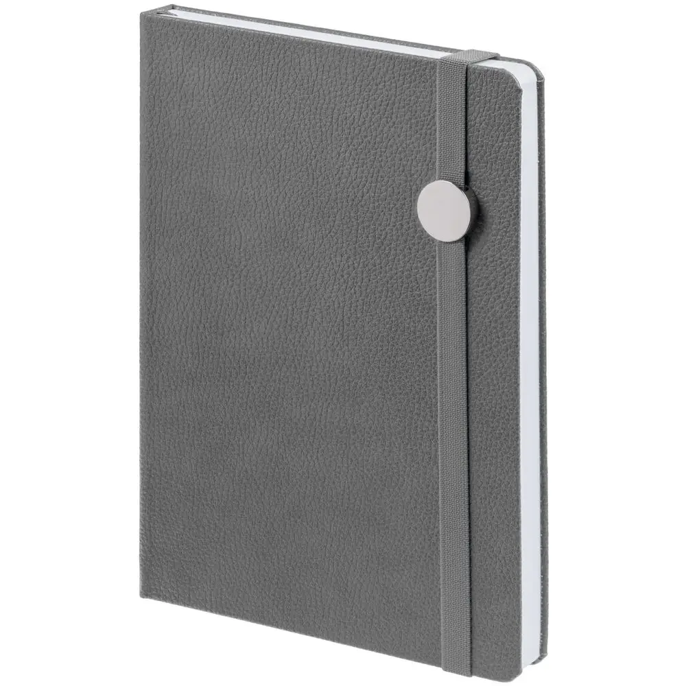 Зауженный ежедневник с круглым металлическим шильдом на резинке.