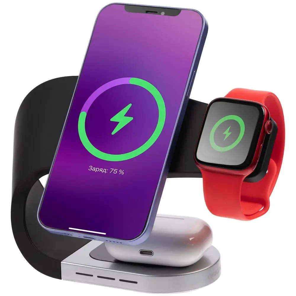 Смартфоны iPhone 12/13/14/15/16 удерживаются встроенными в их корпус магнитами. Прочие смартфоны необходимо дополнить магнитным стикером-адаптером для надежного удержания на зарядной области. Толстый защитный чехол может мешать удержанию смартфона на станции. Индикатор начинает светиться синим только в конце зарядки смартфона. Заряд часов или наушников можно контролировать по их индикаторам заряда.