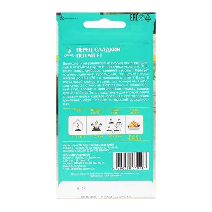 Семена Перец"Потап" F1 сладкий, раннеспелый, среднерослый, плоды кубовидные, красные, 0,05 г