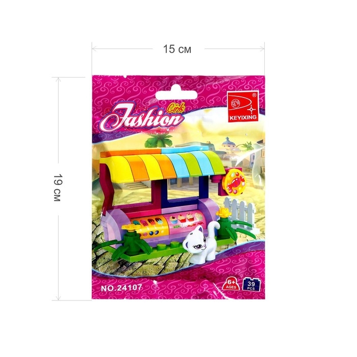 Набор содержит 39 деталей и позволяет сконструировать прилавок с рекламной вывеской, котёнка, аксессуары и фигурку девочки.
