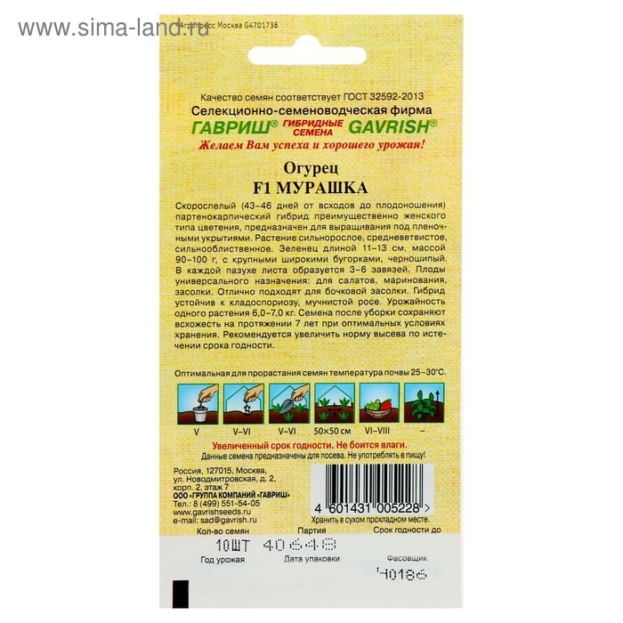 «F1 Мурашка» — это скороспелый партенокарпический гибрид женского типа цветения, у которого период от всходов до плодоношения составляет 43–48 дней. Устойчив к заболеваниям. Предназначен для защищённого и в открытого грунта.