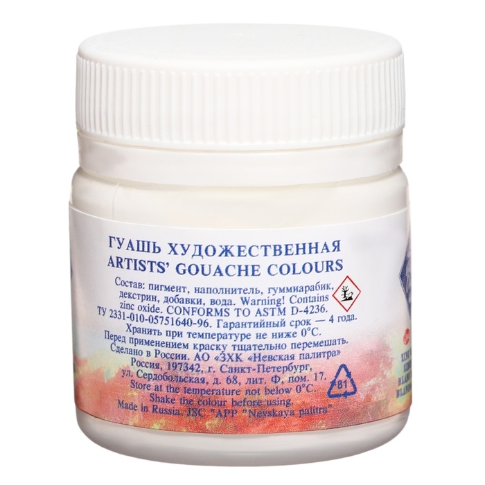 Художественная высококачественная гуашь серии "Мастер Класс" изготавливается из тонкотертых пигментов и связующего с добавлением гуммиарабика. белила и связующие вещества (в том числе гуммиарабик). Белила придают гуаши матовость, позволяют краскам ровно ложиться на поверхность, покрывая ее без просветов.