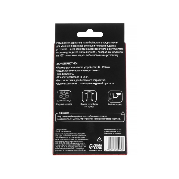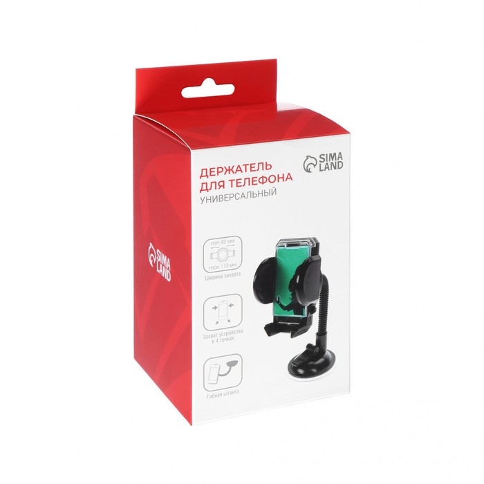 Раздвижной держатель предназначен для удобной и надёжной фиксации телефона и других устройств. Изделие легко крепится на лобовое стекло и регулируется по размеру гаджета (от 42 до 113 мм). Гибкая штанга и поворотный механизм (360°) позволяют задать любое положение гаджету.