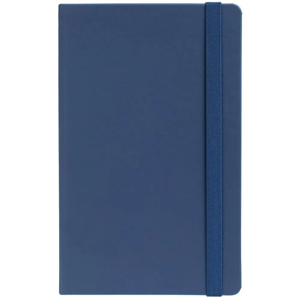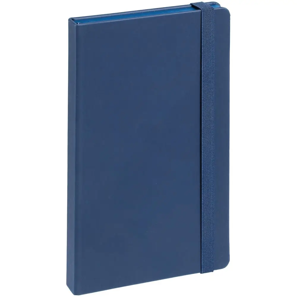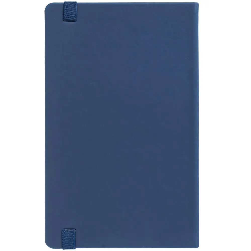 Блокнот в твердой обложке, выполнен из материала Soft Touch Pearl, синий НН, дополнен резинкой и ляссе в цвет обложки.