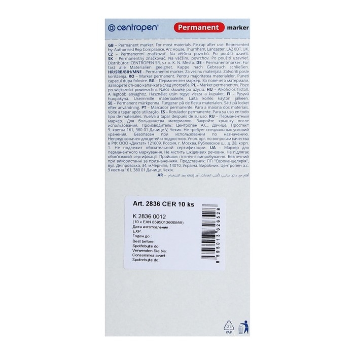 Centropen 2836 — это перманентый маркер, который предназначен для письма на любых поверхностях.