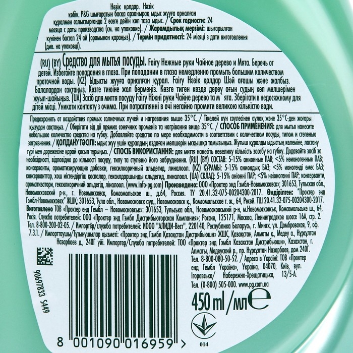 Fairy - безопасный продукт, разработанный в европейском научно-исследовательском центре (Brussels Innovation Centre) и полностью соответствующий ГОСТу РФ.