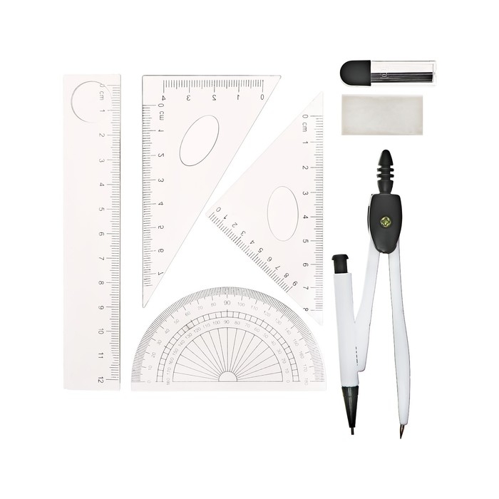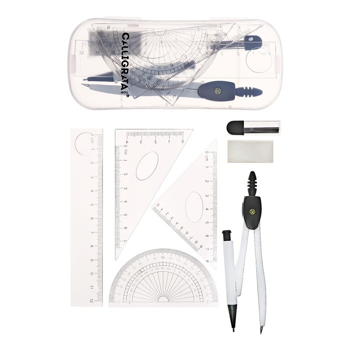 Циркуль металлический 120 мм в пластиковом пенале, с механическим карандашом, грифелями, ластиком, линейкой, 2 треугольниками и транспортиром
