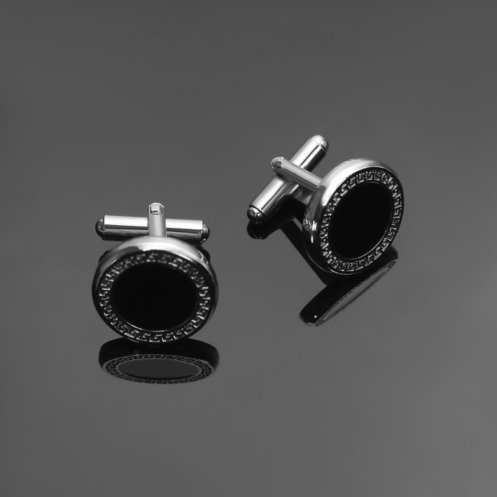Запонки стальные «Классика» круг с эмалью, окантовка с орнаментом, цвет чёрный серебре