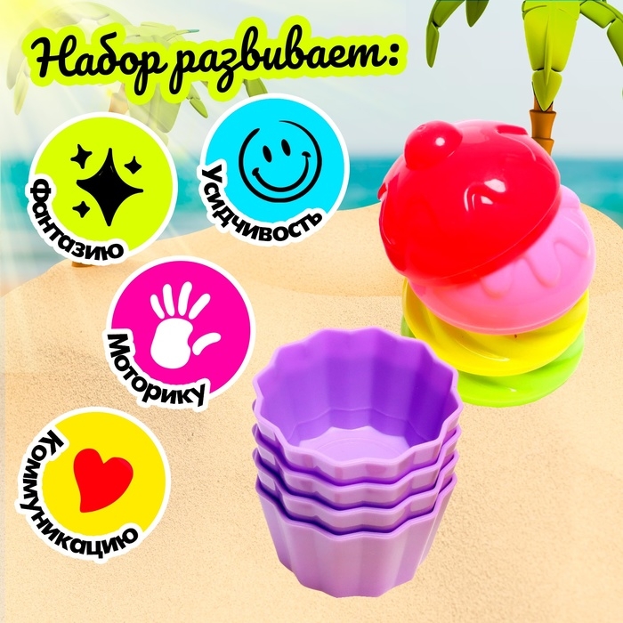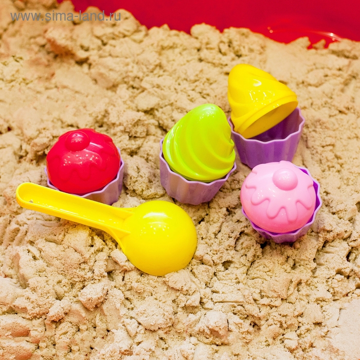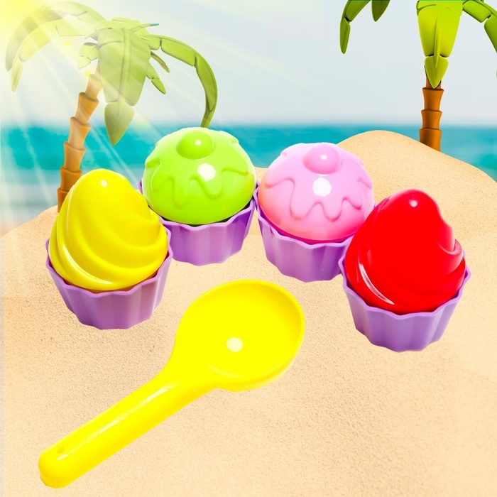 - В наборе четыре разных формочки в форме пирожных и лопатка для создания красивых фигур из песка. Ребёнок, как настоящий кондитер, будет лепить из песка настоящие произведения искусства.