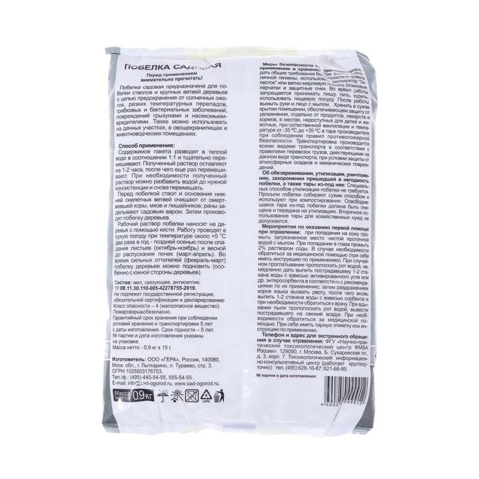 Содержимое пакета разведите в тёплой воде (около +35 °С) и тщательно перемешайте. Полученный раствор оставьте на 2 часа, затем повторно перемешайте. Побелку наносите на деревья с помощью кисти. Покраску проводите в сухую погоду 2 раза в год: поздней осенью после опадания листьев (октябрь–ноябрь) и весной до распускания почек (март–апрель). Во время сильных оттепелей (февраль–март) побелку деревьев можно обновить.