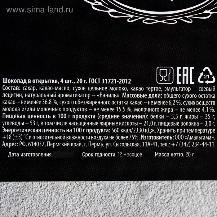 Состав: сахар, масло-какао, молоко сухое цельное, какао тертое, эмульгатор лецитин, ароматизатор "Ванилин". Срок годности: 12 месяцев.