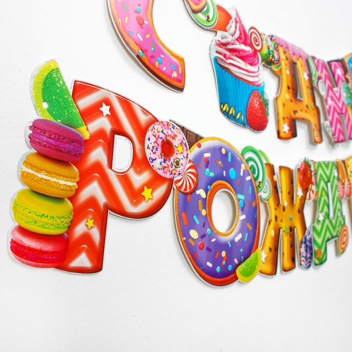 Буквы скреплены с помощью люверсов, что позволяет свободно трансформировать гирлянду. На лицевой стороне напечатана красочная надпись. Аксессуар легко крепится на стену или дверной проём с помощью клейкой ленты или кнопок.