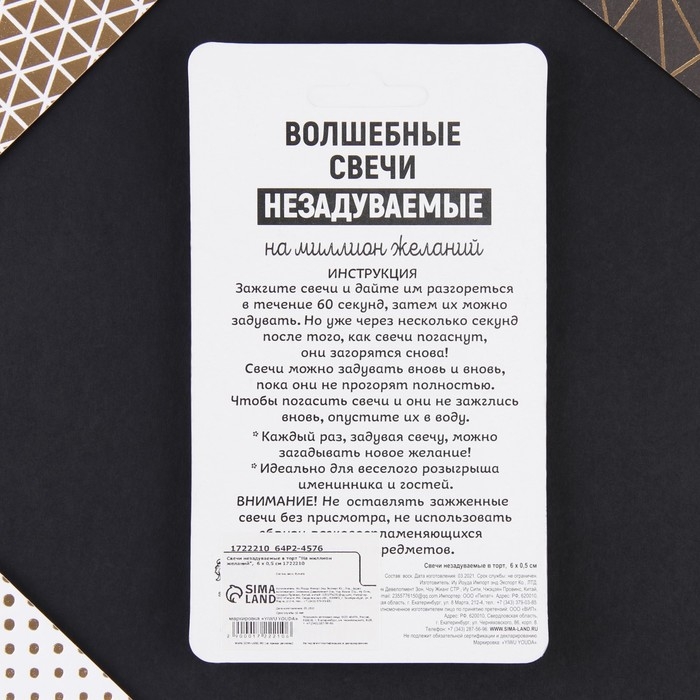 Свечи для торта - это неотъемлемый атрибут праздника. Набор свечей станет прекрасным украшением торта и других кондитерских изделий по случаю дня рождения, юбилея и любого другого торжества. Украсьте угощение стильными свечами, чтобы сделать особенный день ещё более ярким и незабываемым. Для того, чтобы свечи не задувались, им нужно дать 60 секунд разгореться, после чего их можно будет задувать, но уже через несколько секунд, как они погаснут, свечи загорятся снова. Для того,чтобы свечи все-таки потушить, их рекомендуется примочить водой или придавить фитиль свечи. Изготовлены из высокоочищенного пищевого парафина, который не влияет на вкусовые качества блюд, а удобная упаковка помогает сохранять свечи при длительном хранении и транспортировке.