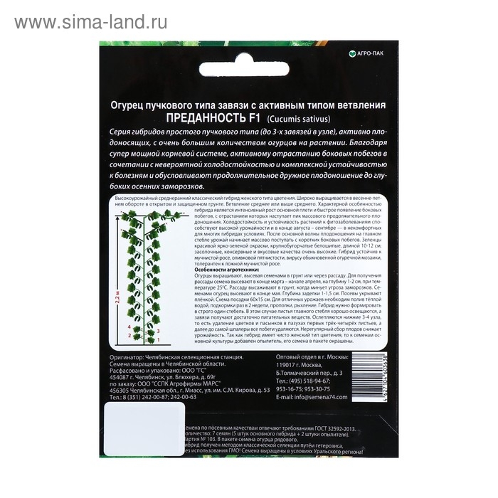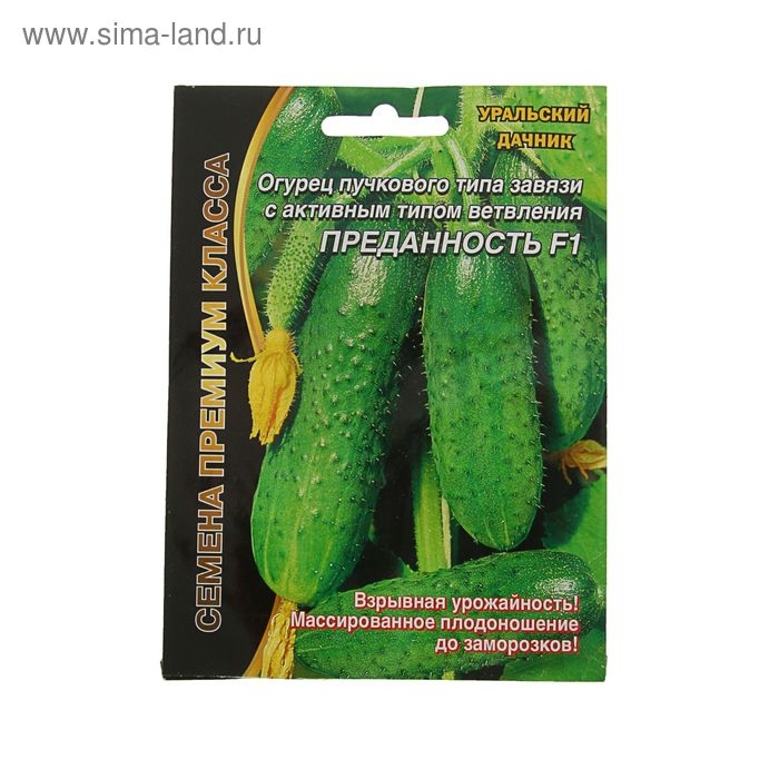 Высокоурожайный среднеранний гибрид женского типа цветения «Преданность» предназначен для открытого и защищённого грунта. Характерная особенность сорта — интенсивный рост основной плети и быстрое появление боковых побегов, с которыми наступает пик массового плодоношения.