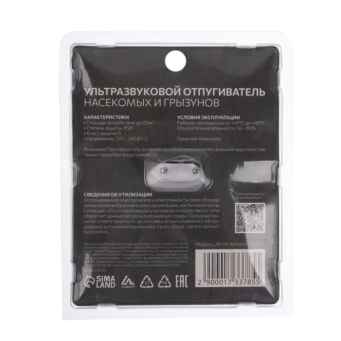 Отпугиватель насекомых и грызунов Luazon LRI-07, ультразвуковой, 200 м2, 220 В, белый