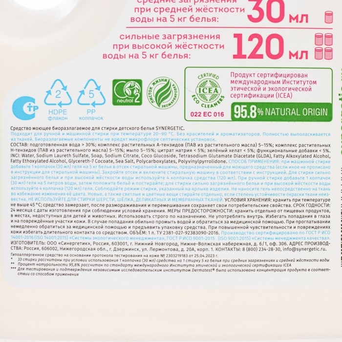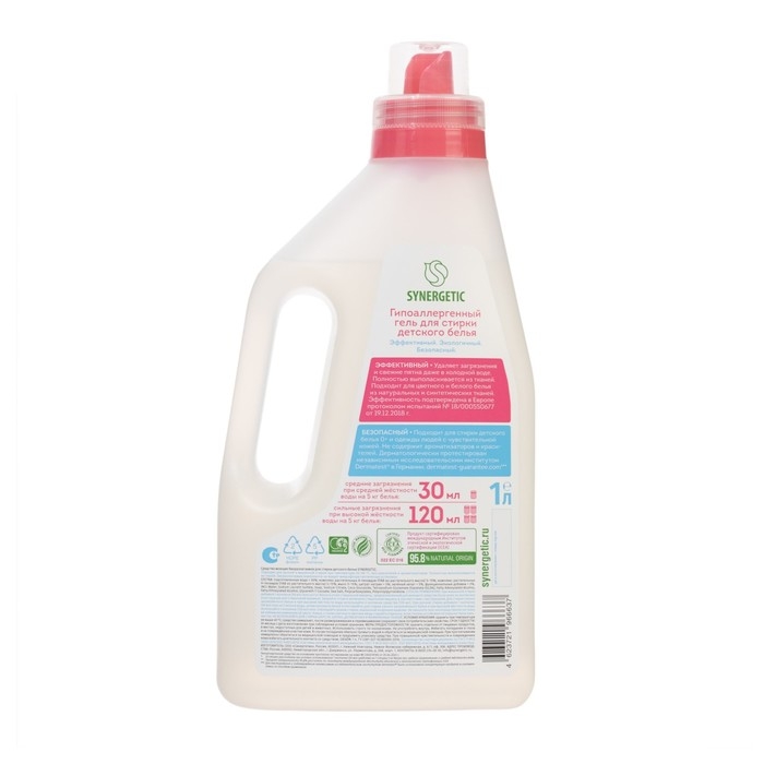 Биоразлагаемый концентрированный гель для стирки SYNERGETIC для детского белья обеспечивает бережное и эффективное очищение тканей и устраняет неприятные запахи. Уникальный комплекс растительных тензидов и зеленых хелатов эффективно удаляет загрязнения и свежие пятна с волокон ткани даже в холодной воде.