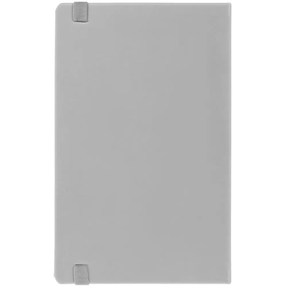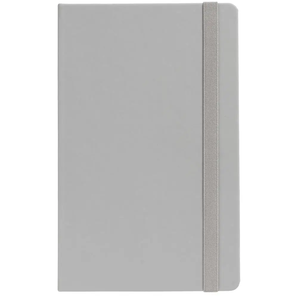 Блокнот в твердой обложке, выполнен из материала Soft Touch, серый СС, дополнен резинкой и ляссе в цвет обложки.