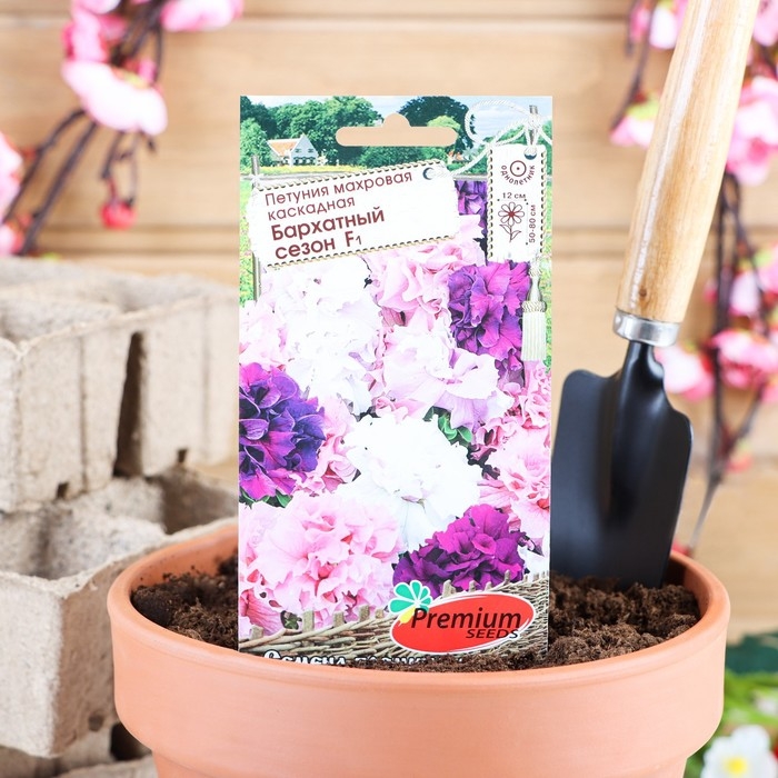 «Бархатный сезон» — это смесь ярких махровых каскадных петуний. Растение имеет гибкие длинные стебли, многочисленные крупные бутонами разнообразной окраски по 12 см в диаметре. Сорт отличает обильное и продолжительное цветение и быстрое развитие, что делает его превосходным декоративным элементом для балконов, подвесных кашпо и корзин. Растение предпочитает лёгкие, плодородные, хорошо дренированные почвы.