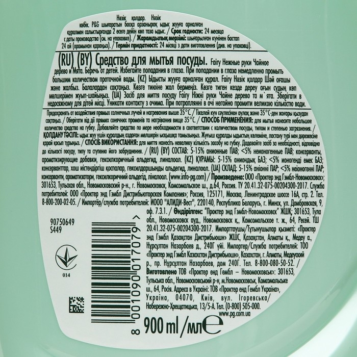 Fairy - безопасный продукт, разработанный в европейском научно-исследовательском центре (Brussels Innovation Centre) и полностью соответствующий ГОСТу РФ.