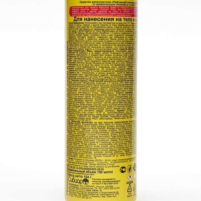 ОписаниеРепеллентный аэрозоль от комаров "Рефтамид" Антикомар Усиленный с ароматом ванили/цитруса - это эффективное средство, которое защитит вас от укусов насекомых во время отдыха на природе или прогулки по лесу.Для достижения максимальной эффективности, рекомендуется наносить репеллент на одежду и открытые части тела. При этом следует помнить, что продукт не предназначен для нанесения на лицо.В состав репеллента входят натуральные компоненты, такие как экстракты растений, которые обладают отталкивающими свойствами по отношению к комарам и другим насекомым. Благодаря этому, вы сможете наслаждаться прогулками на свежем воздухе, не беспокоясь о возможных укусах.Однако, необходимо соблюдать меры предосторожности при использовании данного средства. Не рекомендуется наносить репеллент на поврежденную кожу или на места, где имеются высыпания. Также следует избегать попадания продукта в глаза и на слизистые оболочки.В целом, аэрозоль репеллентный от комаров "Рефтамид" Антикомар Усиленный с ароматом ванили/цитруса - это безопасное и эффективное средство для защиты от комаров и других насекомых. Оно позволит вам наслаждаться природой без дискомфорта и опасений.СоставN,N-диэтил-м-толуамид (ДЭТА) 20%, диметилфталат 10%, бутан/пропан/изобутан смесь >30%, (спирт входящий в рецептуру) * 15-30%, глицерин < 5%.