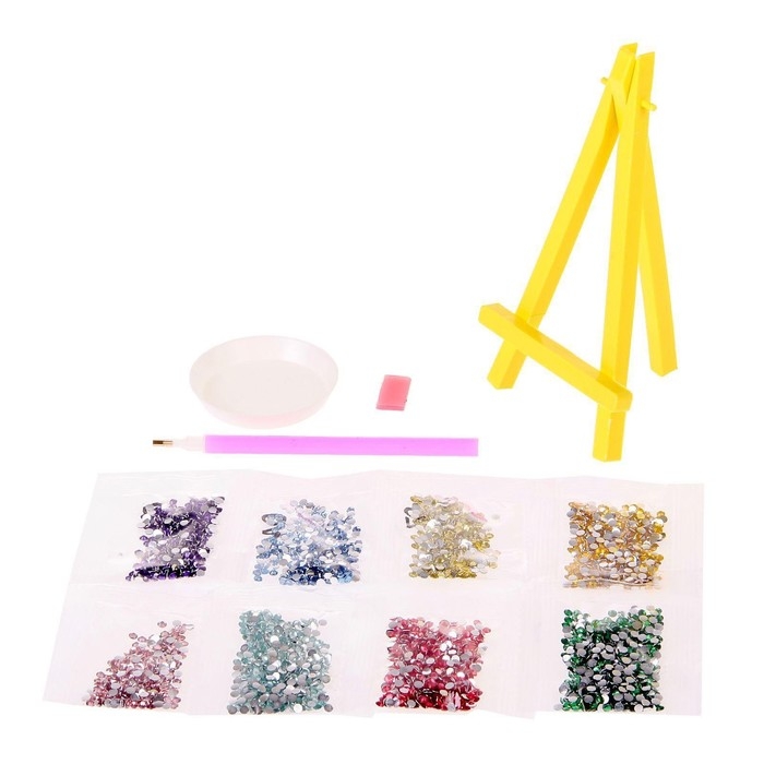 В наборе есть небольшой мольберт: с ним готовое творение можно расположить на полке или столе без дополнительных креплений. В таком интересном оформлении сверкающая картина будет выглядеть как предмет искусства.