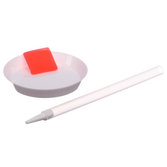 Снимите защитную плёнку с клеевой подушечки. Окуните в неё карандаш для алмазной вышивки таким образом, чтобы клей попал внутрь стержня. Он поможет вам с лёгкостью перенести стразы из поддона на картинку.