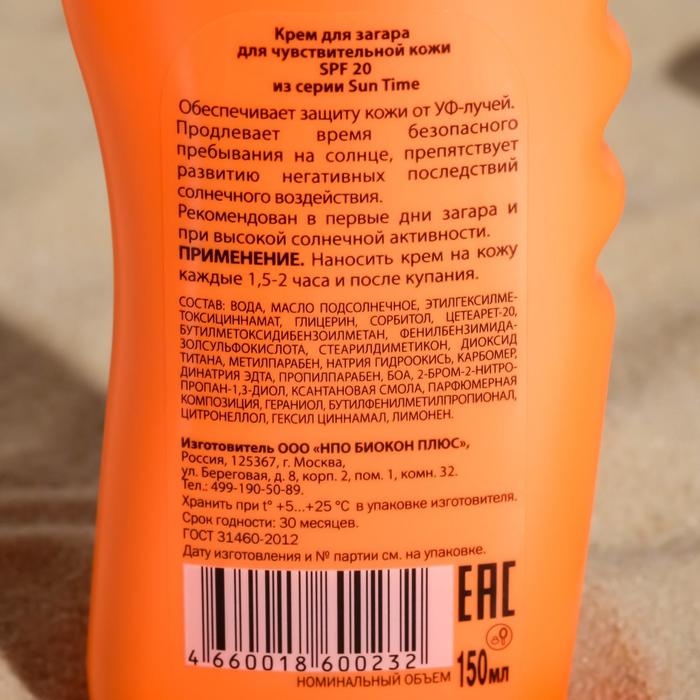 Молочко для загара солнцезащитное, водостойкое, SPF 20, 125 мл
