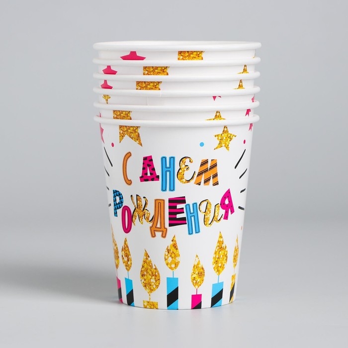 Стакан одноразовый бумажный "С Днем рождения" свечи и звезды, 250 мл. (набор 6 шт.)