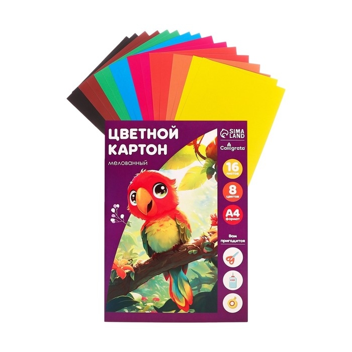 Картон цветной А4, 16 листов, 8 цветов, в папке "Попугай", мелованный 240 г/м2