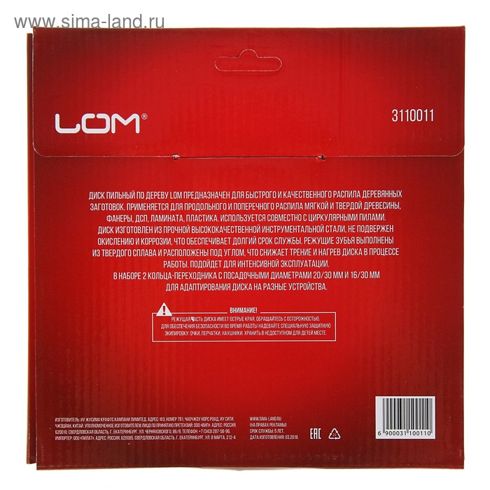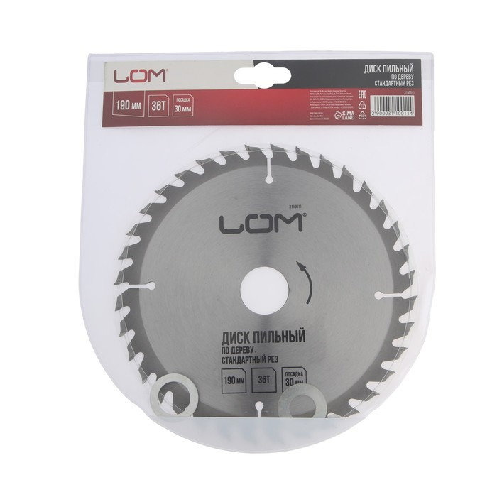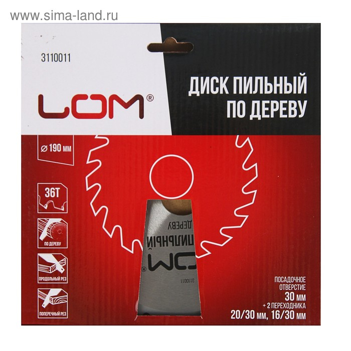 Диск пильный по дереву ЛОМ, стандартный рез, 190 х 30 мм (кольца на 20, 16), 36 зубьев