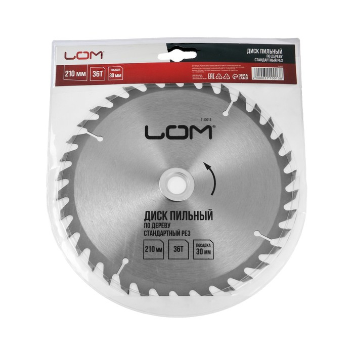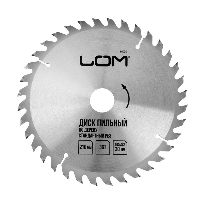 Диск пильный по дереву ЛОМ, стандартный рез, 210 х 30 мм (кольца на 20, 16), 36 зубьев