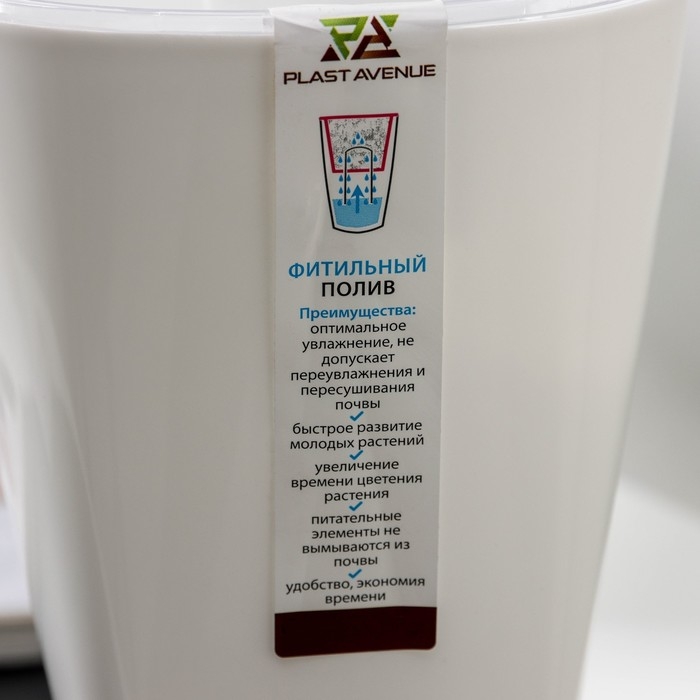 Кашпо серии «Грейс» имеют систему фитильного полива. Это удобно, когда необходимо на длительное время оставить растения без присмотра — можно не беспокоиться о поливе.