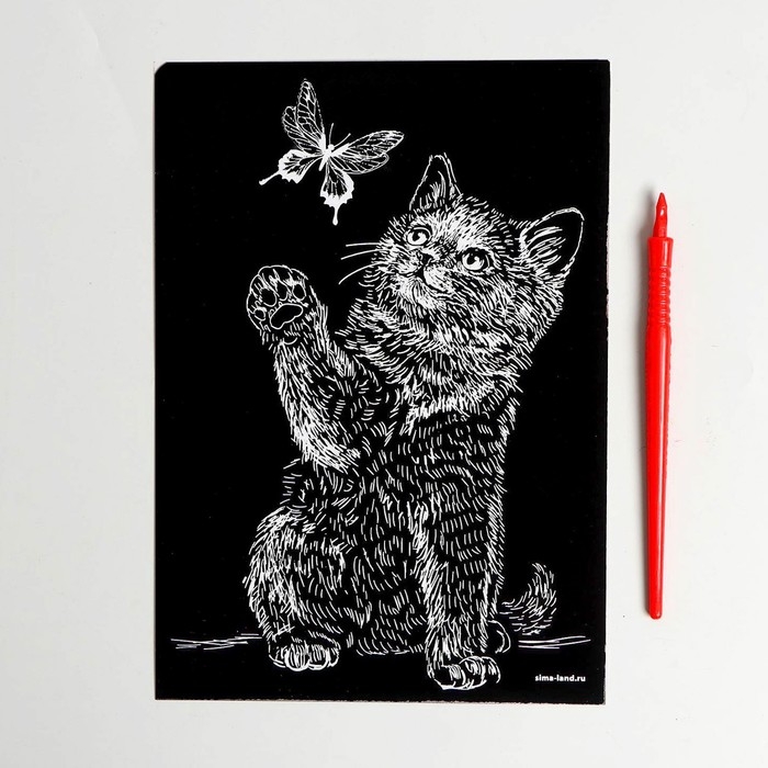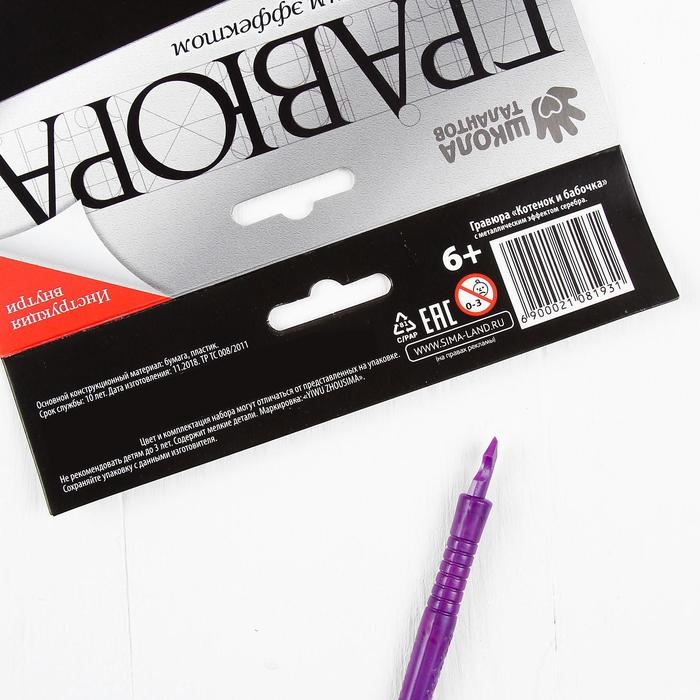 Гравюра «Котёнок и бабочка» с металлическим эффектом «серебро» А5