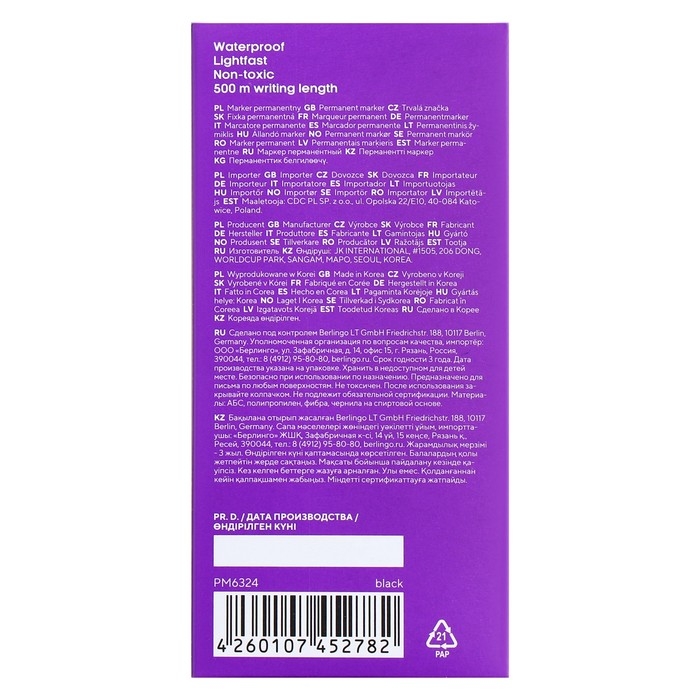 Подходит для письма на любых поверхностях. Чернила на спиртовой основе. Плотный колпачок с клипом надежно предотвращает высыхание. Цвет колпачка соответствует цвету чернил. Закругленный пишущий узел. Ширина линии - 1 мм. Длина непрерывной линии - 500 м. Упакован в картонную коробочку по 12 шт.