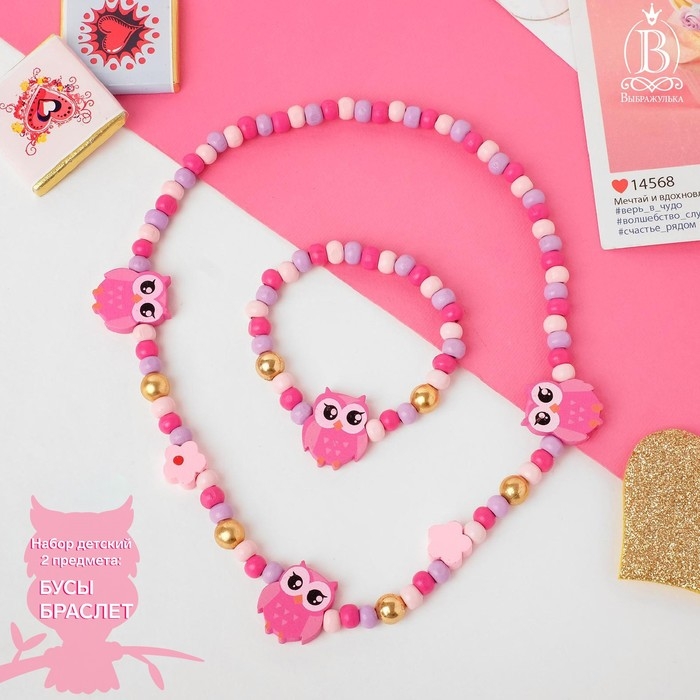 Набор детский «Выбражулька» 2 предмета: бусы, браслет, совы, цветной