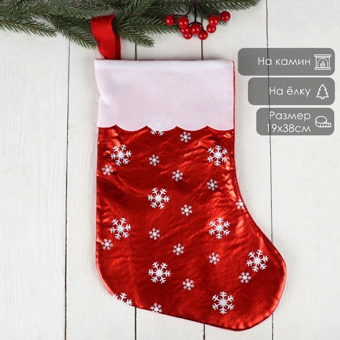 Носок для подарков "Мерцание" красный со снежинками, 19х38 см, красный