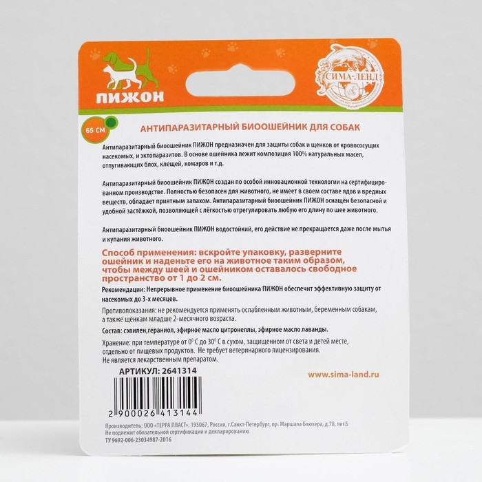 Антипаразитарный биоошейник "ПИЖОН" предназначен для защиты собак и щенков от кровососущих насекомых и эктопаразитов. В основе ошейника лежит композиция 100% натуральных масел, отпугивающих блох, клещей, комаров и т.д.