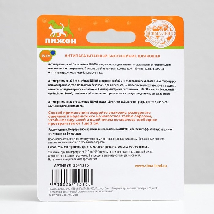 Антипаразитарный биоошейник "ПИЖОН" предназначен для защиты кошек и котят от кровососущих насекомых и эктопаразитов. В основе ошейника лежит композиция 100% натуральных масел, отпугивающих блох, клещей, комаров и т.д.