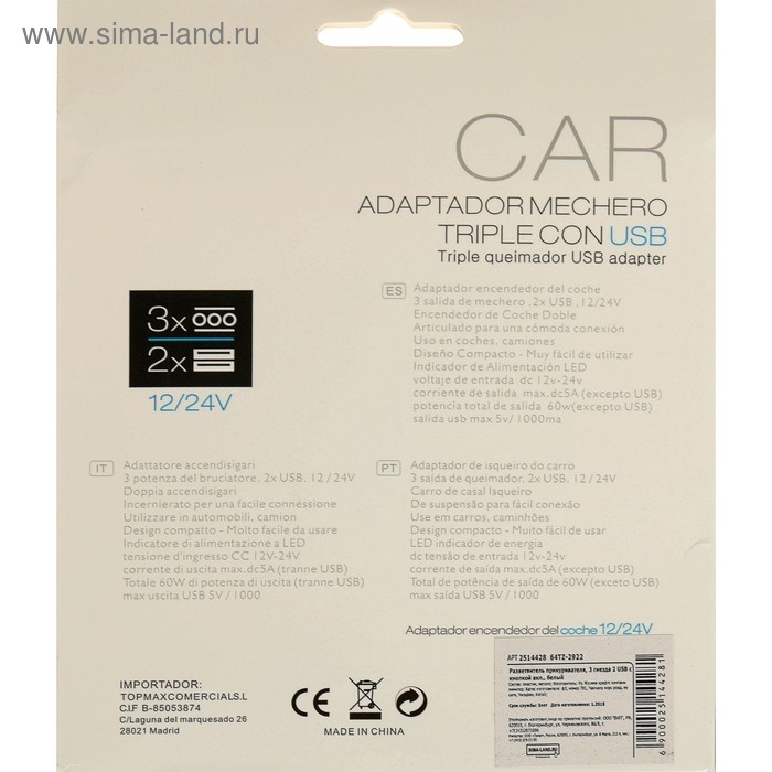 Разветвитель прикуривателя TORSO, 12-24 В, USB, провод 50 см, подсветка