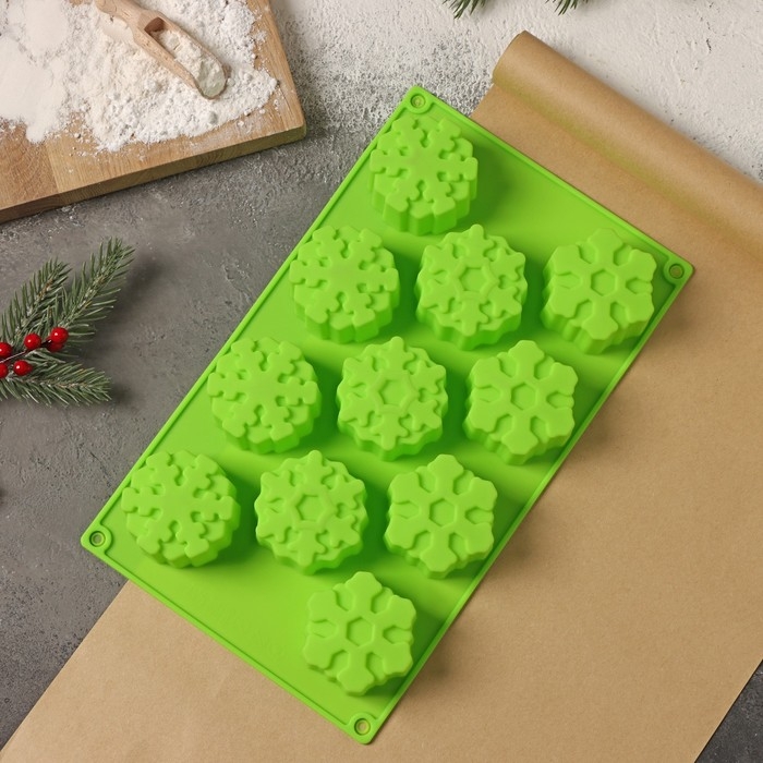 Форма для выпечки новогодняя Доляна «Снежинка», силикон, 30×17,5 см, 11 ячеек, цвет салатовый
